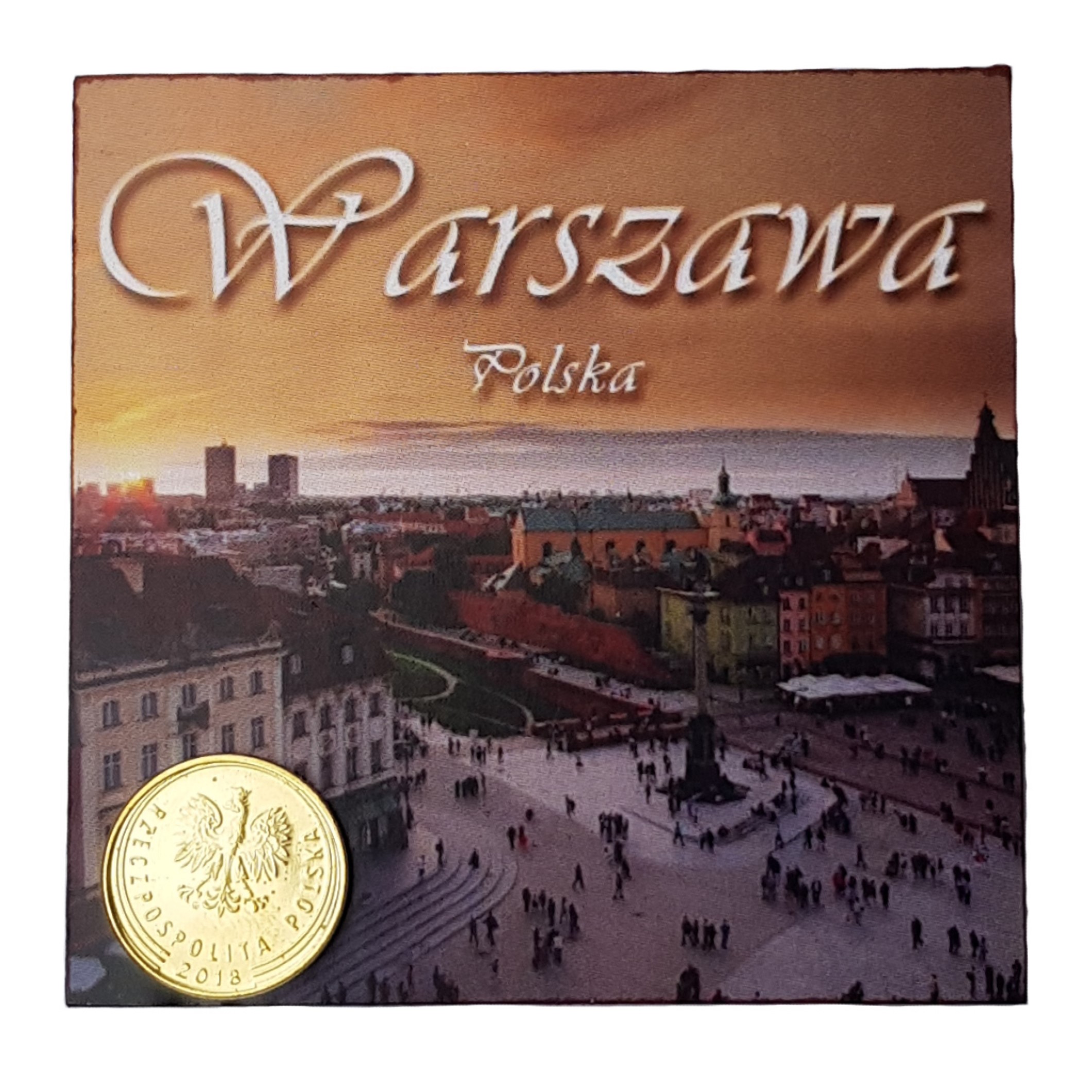 Drewniany magnes z grafiką przedstawiającą Plac Zamkowy w Warszawie, z dołączonym groszem.