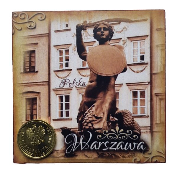 Drewniany magnes z grafiką przedstawiającą staromiejską Syrenkę w Warszawie, z dołączonym groszem.