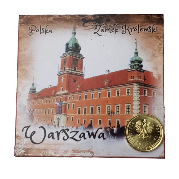 Drewniany magnes z grafiką przedstawiającą Zamek Królewski w Warszawie, z dołączonym groszem.
