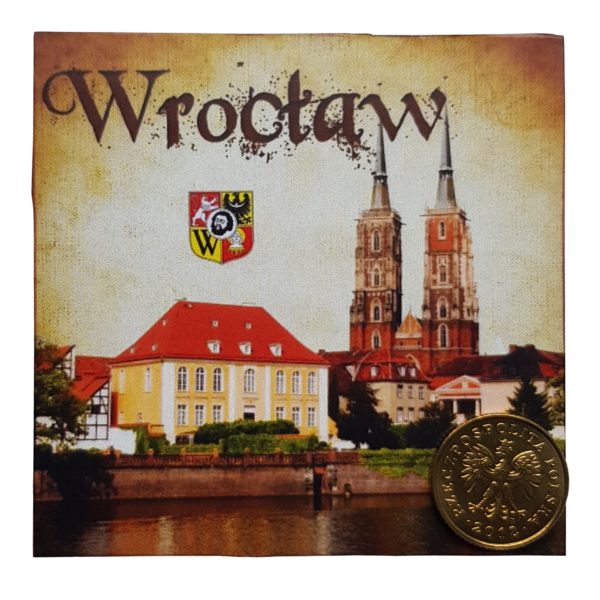 Drewniany magnes z grafiką przedstawiającą Archikatedrę św. Jana Chrzciciela na Ostrowie Tumskim we Wrocławiu, z dołączonym groszem.