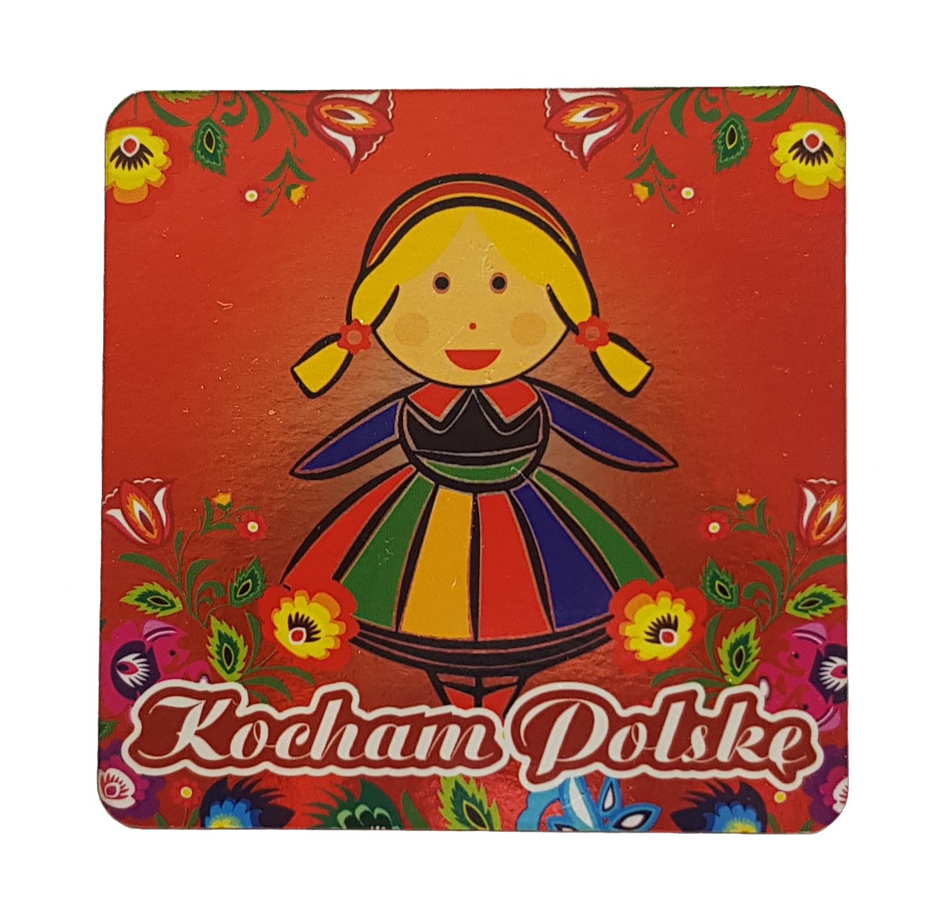 Magnes holograficzny ze sklejki, przedstawiający lalkę z motywami folklorystycznymi i napisem ” Kocham Polskę “.