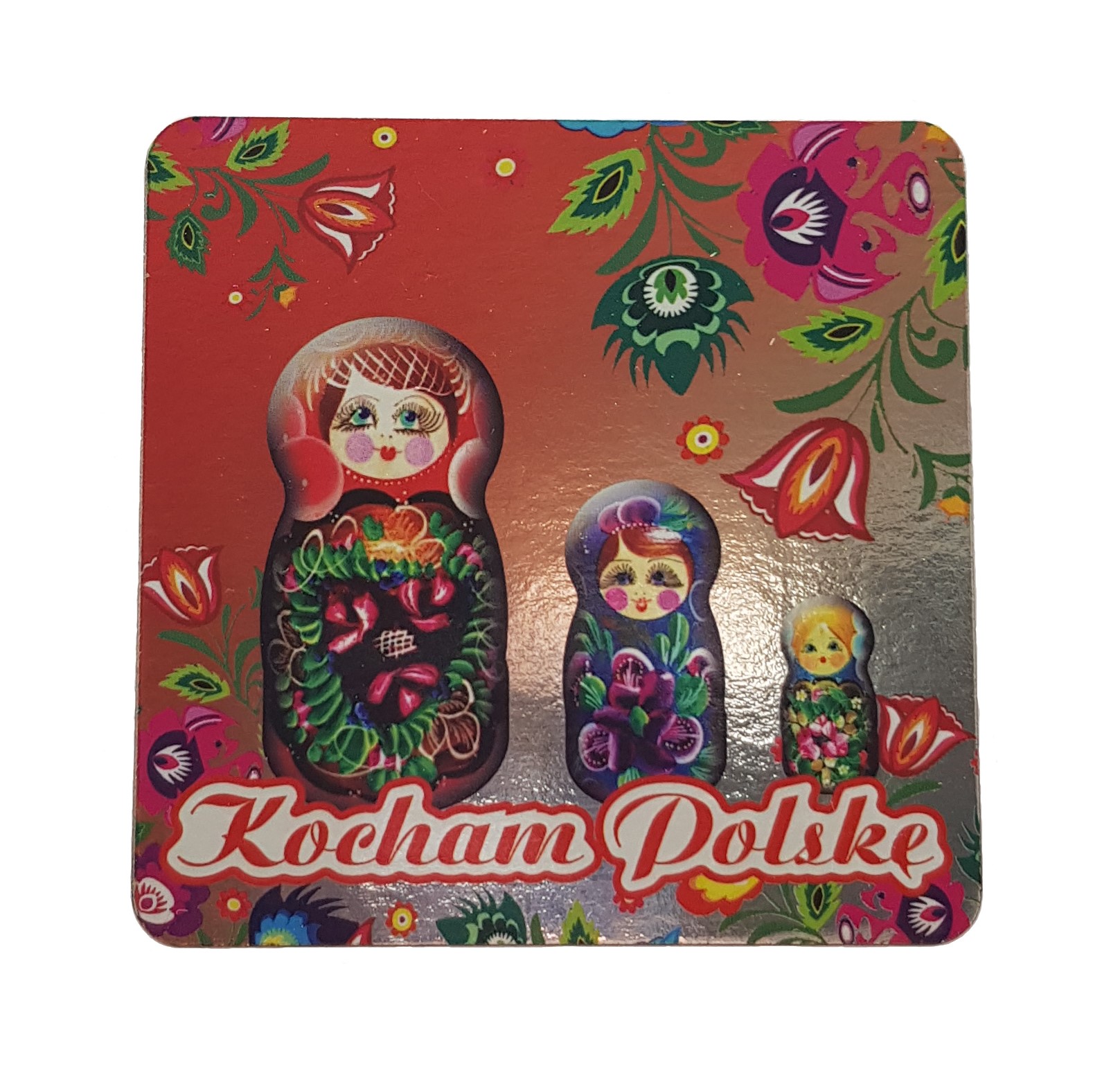 Magnes holograficzny ze sklejki, przedstawiający matrioszki z motywami folklorystycznymi i napisem ” Kocham Polskę “.
