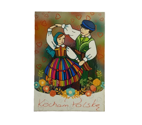 Magnes holograficzny ze sklejki, przedstawiający tańczącą parę z motywami folklorystycznymi i napisem ” Kocham Polskę “.