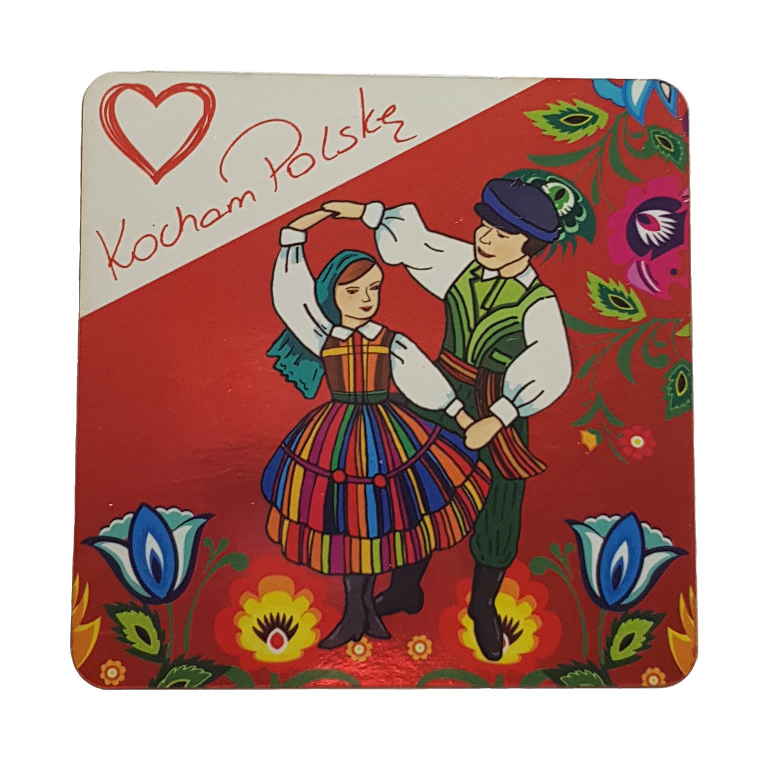 Magnes holograficzny ze sklejki, przedstawiający tańczącą parę z motywami folklorystycznymi i napisem ” Kocham Polskę “.
