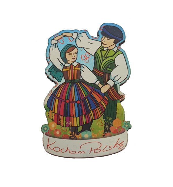 Magnes holograficzny ze sklejki, przedstawiający tańczącą parę z motywami folklorystycznymi i napisem ” Kocham Polskę “.