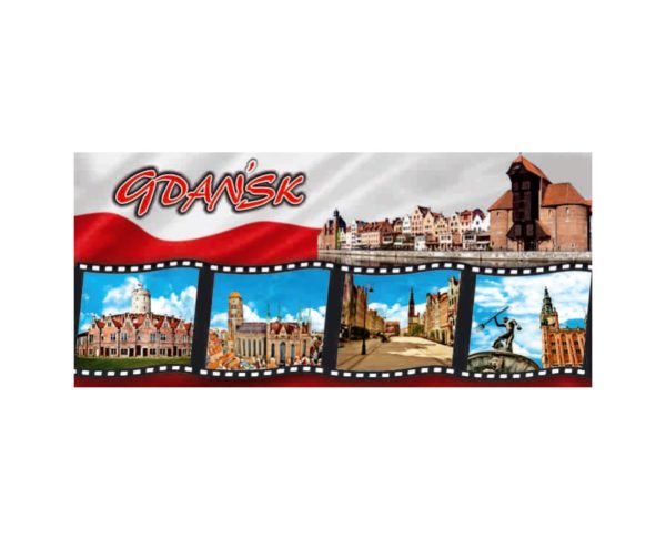 Magnes Holograficzny z nadrukowaną grafiką przedstawiającą niektóre z najciekawszych zabytków Gdańska pokazanych w kadrze filmowym na tle Flagi.