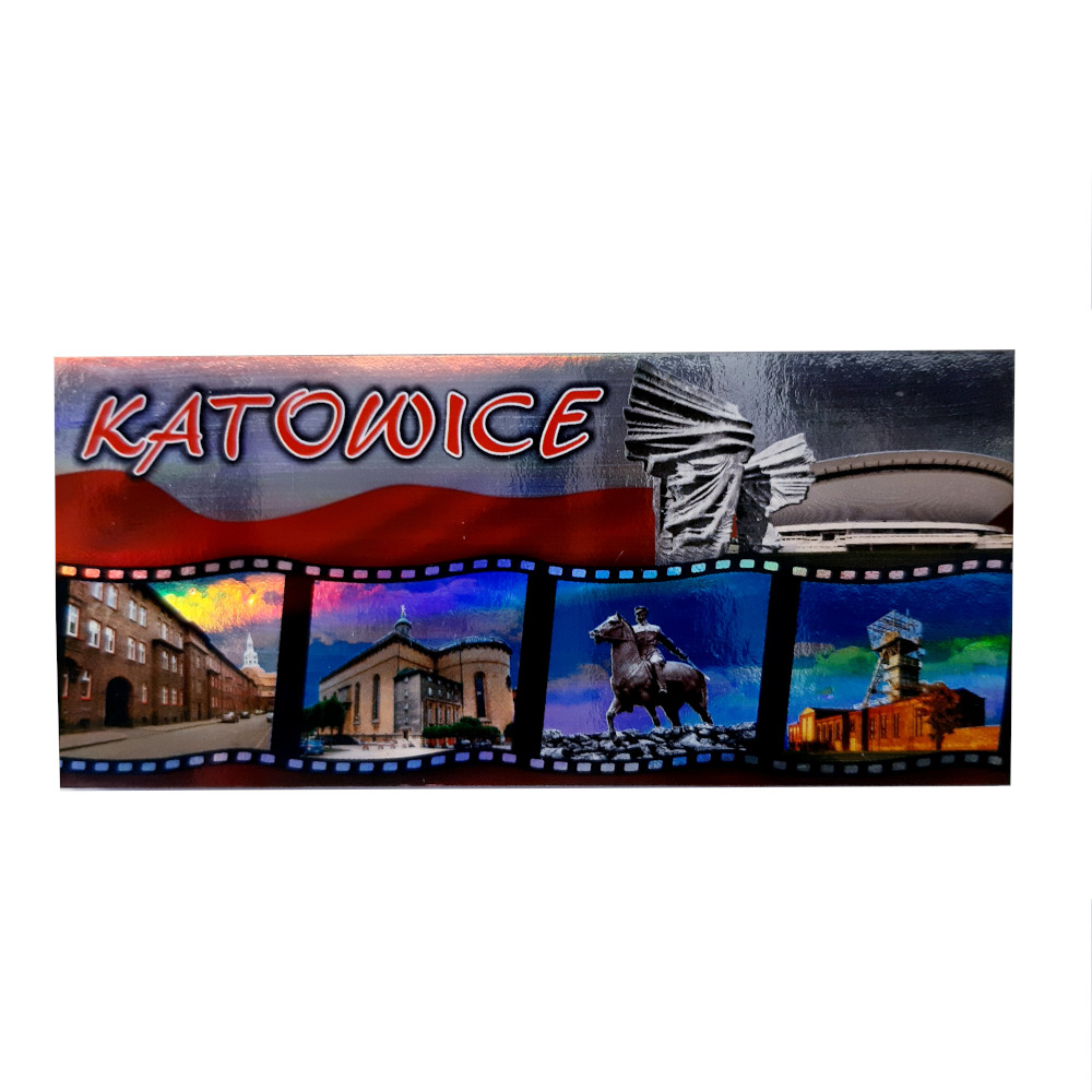 Magnes Holograficzny z nadrukowaną grafiką przedstawiającą niektóre z najciekawszych zabytków i atrakcji Katowic ułożonych w jeden obraz.