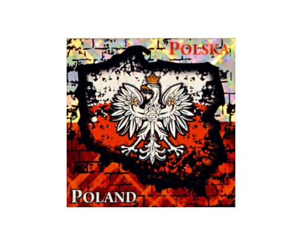Magnes Holograficzny z nadrukowaną grafiką przedstawiającą Orła w konturze mapy Polski na biało czerwonym tle.
