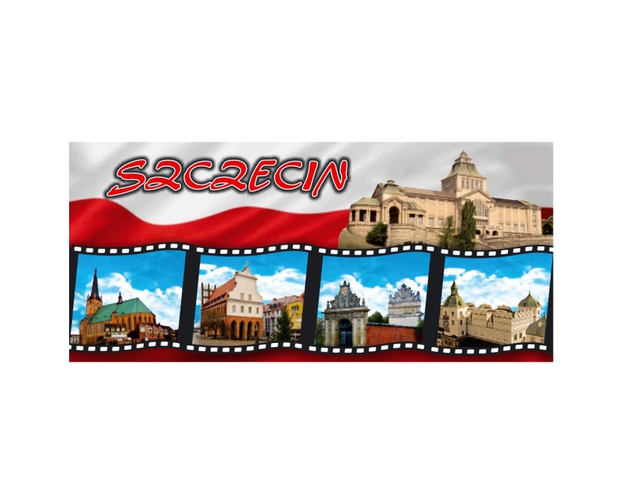 Magnes Holograficzny z nadrukowaną grafiką przedstawiającą niektóre z najciekawszych zabytków Szczecina pokazanych w kadrze filmowym na tle Flagi.