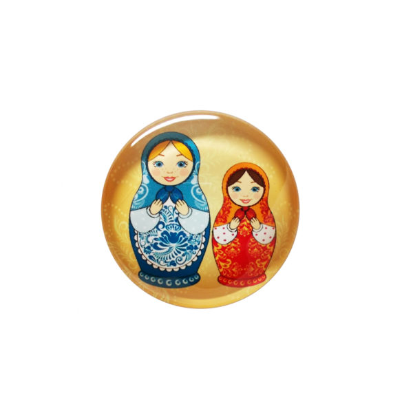 Szklany magnes z wizerunkiem matrioszki w kształcie koła.