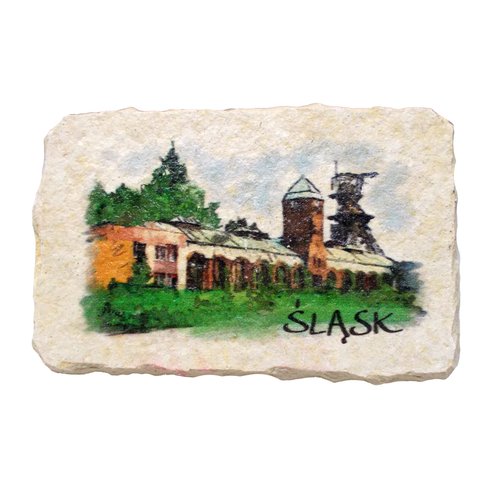 Magnes na skale wapiennej z obrazkiem Ślaska kopalni