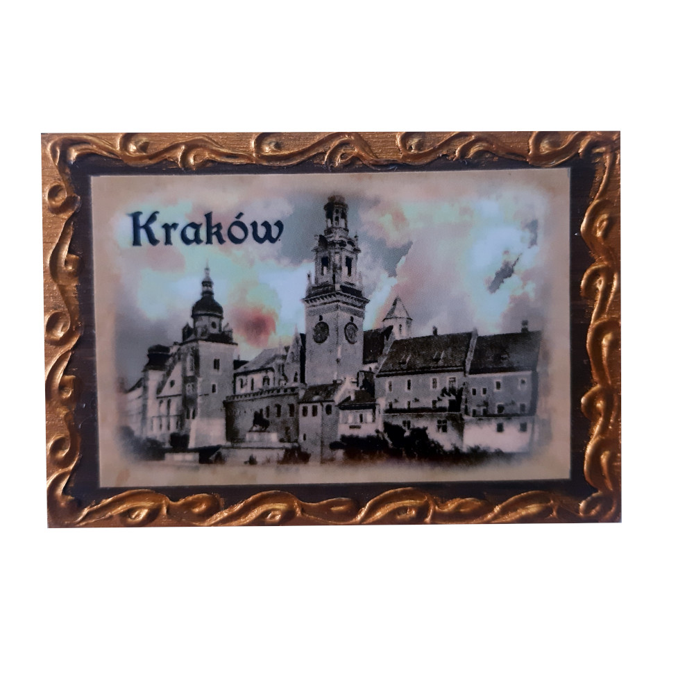 Obrazek na deseczce ozdobiony ramką wykonaną ze złotej farby przedstawiający miasto Kraków
