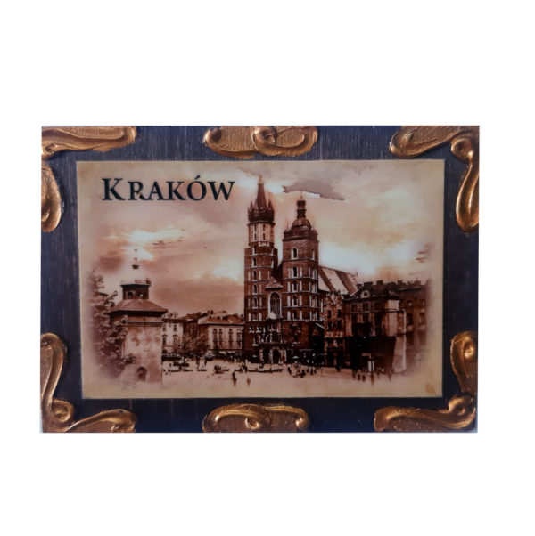 Obrazek na deseczce ozdobiony ramką wykonaną ze złotej farby przedstawiający miasto Kraków