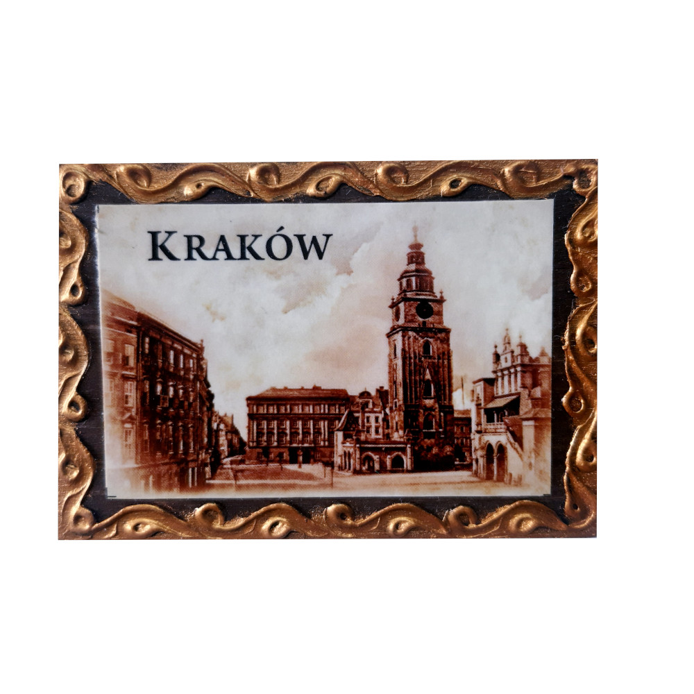 Obrazek na deseczce ozdobiony ramką wykonaną ze złotej farby przedstawiający miasto Kraków