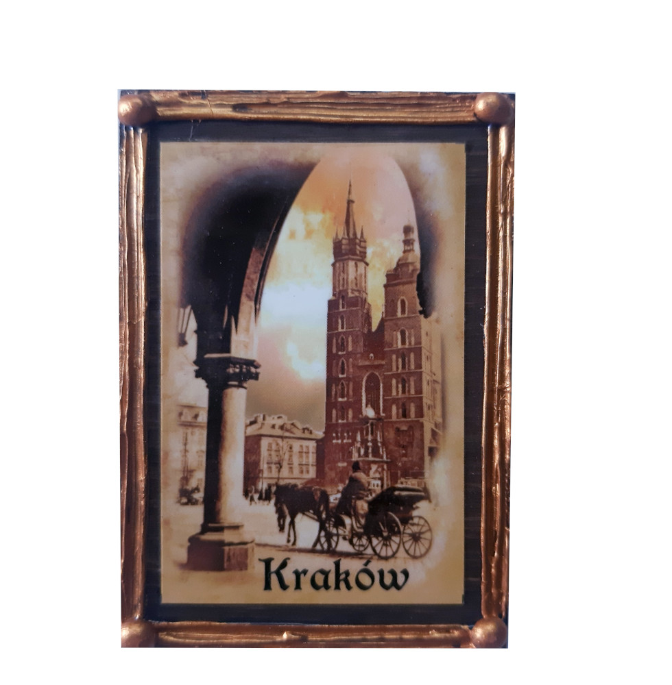Obrazek na deseczce ozdobiony ramką wykonaną ze złotej farby przedstawiający miasto Kraków