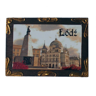 Obrazek na deseczce ozdobiony ramką wykonaną ze złotej farby przedstawiający miasto Łódź