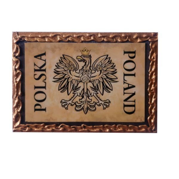 Obrazek na deseczce ozdobiony ramką wykonaną ze złotej farby przedstawiający Polskę