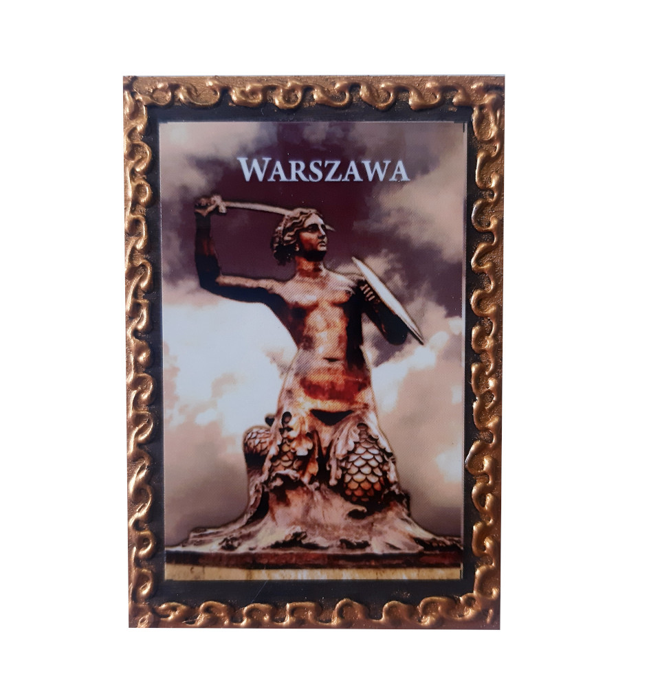 Obrazek na deseczce ozdobiony ramką wykonaną ze złotej farby przedstawiający miasto Warszawa