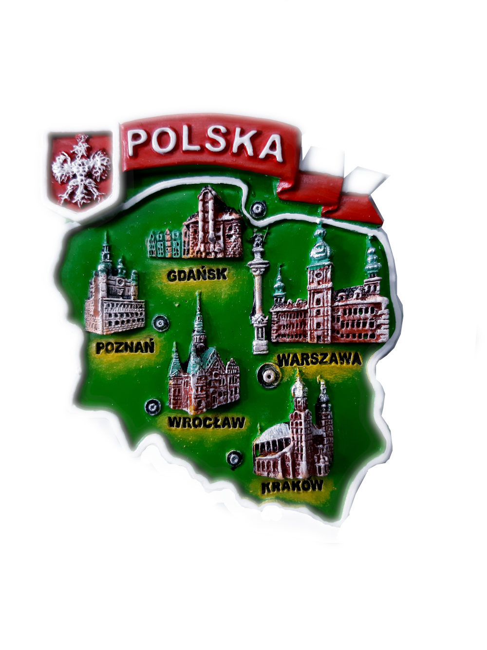 Magnes policeramiczny (z żywicy syntetycznej) w kształcie mapy Polski z najpiękniejszymi miastami i ich zabytkami.