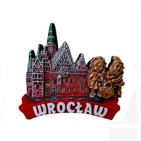 Magnes policeramiczny (z żywicy syntetycznej) przedstawiający parę krasnali i napis Wrocław
