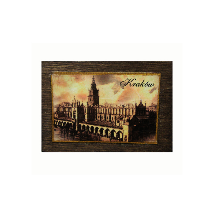 Obrazek w stylistyce retro naklejony na deseczkę z magnesem. Wzór przedstawiający Sukiennice.