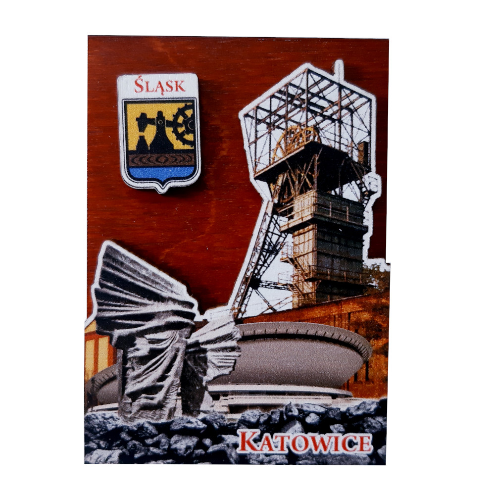 Magnes drewniany z obrazkiem dwuwymiarowym, przedstawiającym miasto Katowice