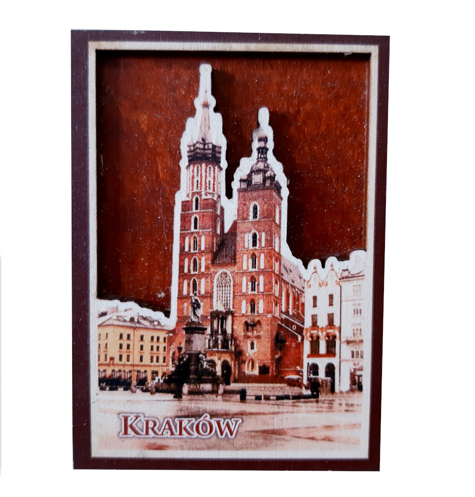 Magnes drewniany z obrazkiem dwuwymiarowym, przedstawiającym miasto Kraków