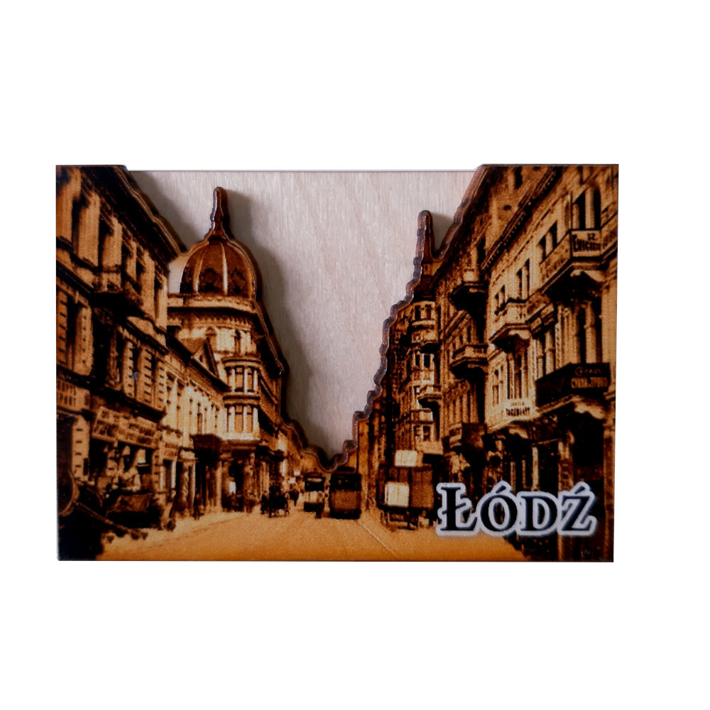 Magnes drewniany z obrazkiem dwuwymiarowym, przedstawiającym miasto Łódź
