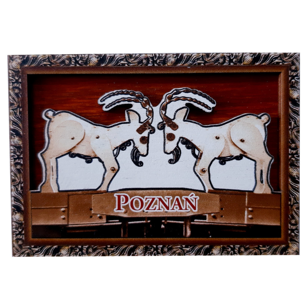 Magnes drewniany z obrazkiem dwuwymiarowym, przedstawiającym miasto Poznań
