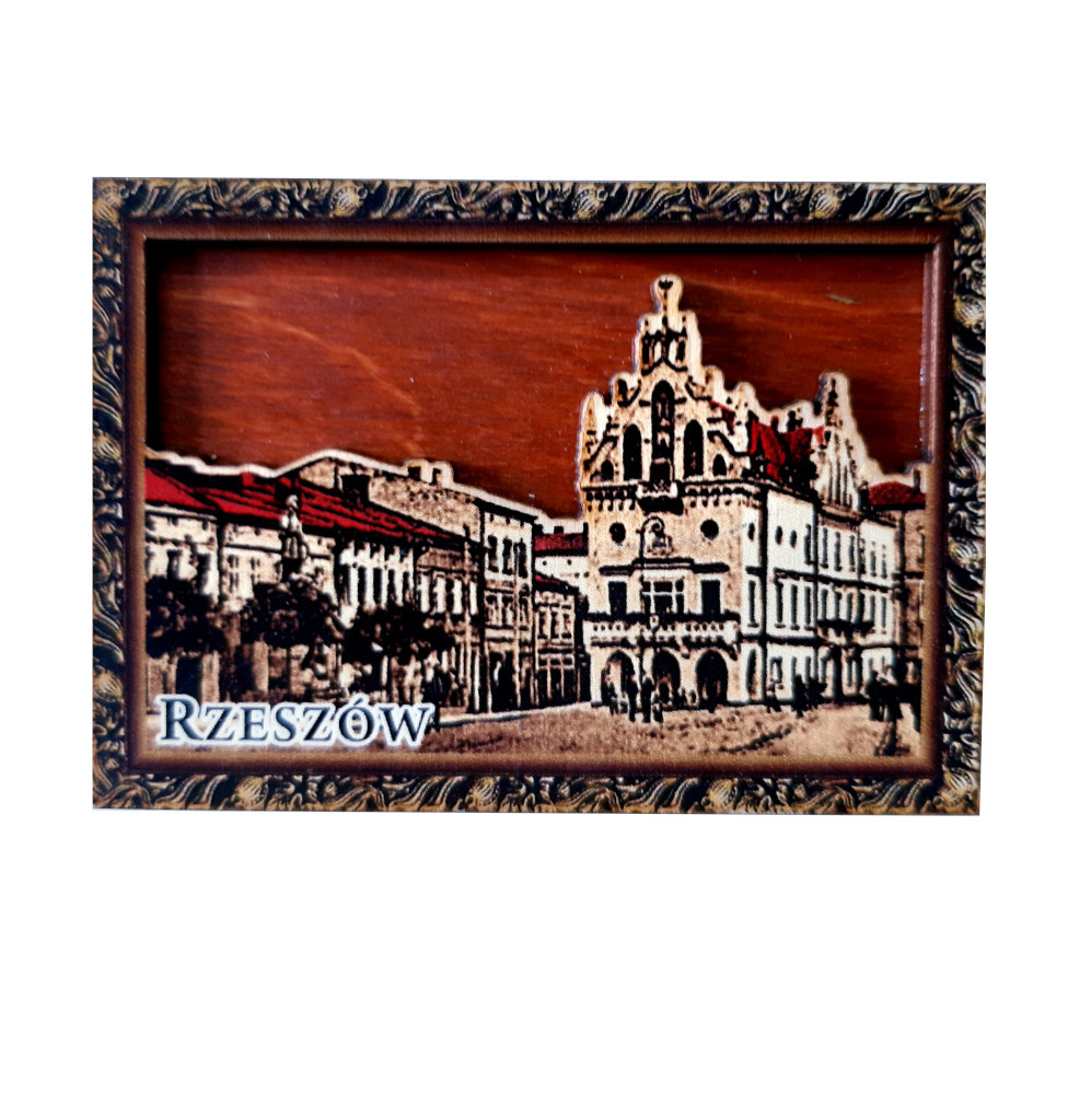 Magnes drewniany z obrazkiem dwuwymiarowym, przedstawiającym miasto Rzeszów