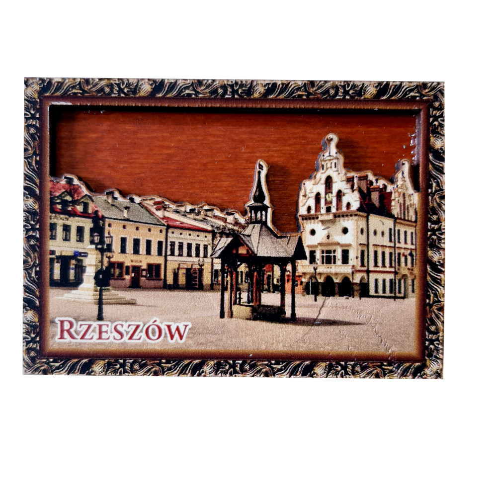 Magnes drewniany z obrazkiem dwuwymiarowym, przedstawiającym miasto Rzeszów
