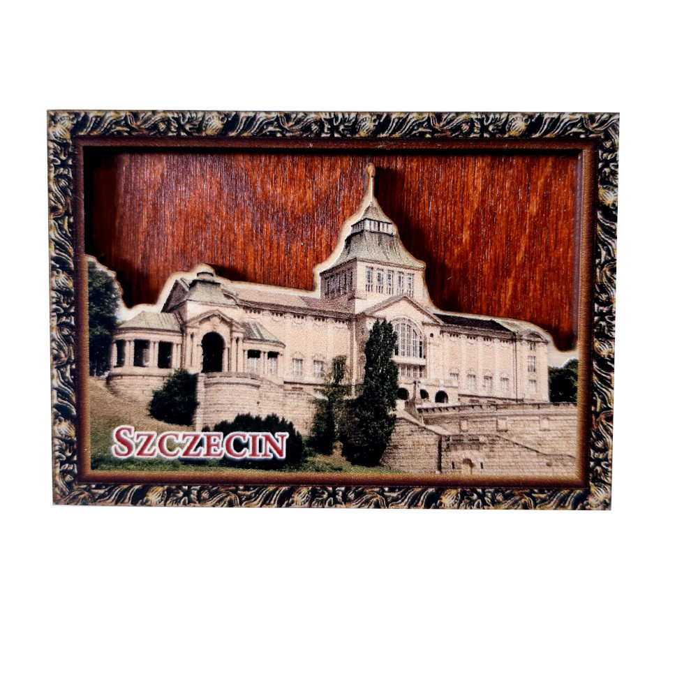 Magnes drewniany z obrazkiem dwuwymiarowym, przedstawiającym miasto Szczecin