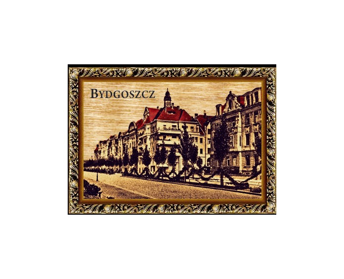 Magnes wykonany ze sklejki z nadrukowaną grafiką przedstawiającą zabytki Bydgoszczy.