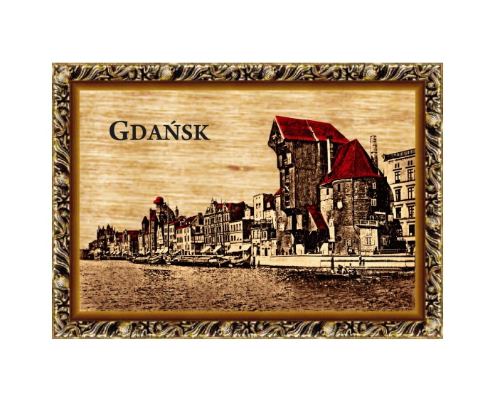 Magnes wykonany ze sklejki z nadrukowaną grafiką przedstawiającą zabytki Gdańska.