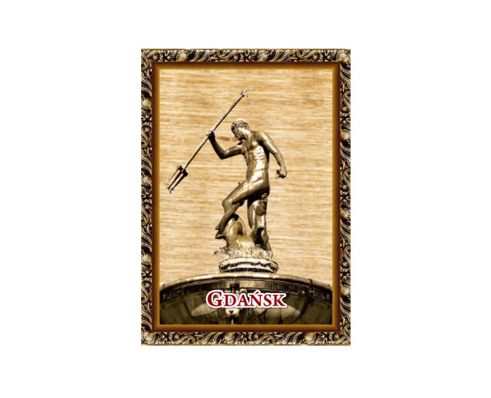 Magnes wykonany ze sklejki z nadrukowaną grafiką przedstawiającą zabytki Gdańska.