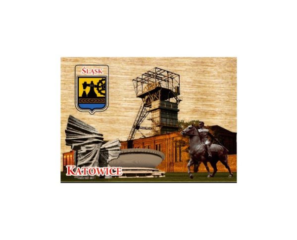 Magnes wykonany ze sklejki z nadrukowaną grafiką przedstawiającą zabytki Katowic.