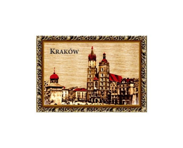 Magnes wykonany ze sklejki z nadrukowaną grafiką przedstawiającą zabytki Krakowa.