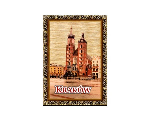 Magnes wykonany ze sklejki z nadrukowaną grafiką przedstawiającą zabytki Krakowa.