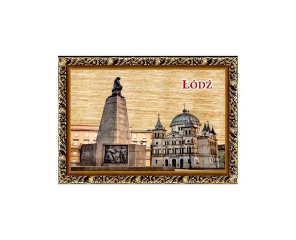 Magnes wykonany ze sklejki z nadrukowaną grafiką przedstawiającą zabytki Łodzi.