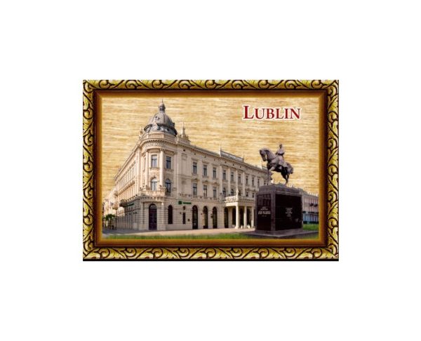 Magnes wykonany ze sklejki z nadrukowaną grafiką przedstawiającą zabytki Lublina.