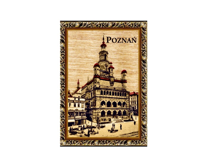 Magnes wykonany ze sklejki z nadrukowaną grafiką przedstawiającą zabytki Poznania.