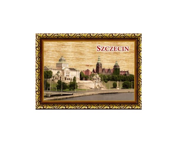 Magnes wykonany ze sklejki z nadrukowaną grafiką przedstawiającą zabytki Szczecina.
