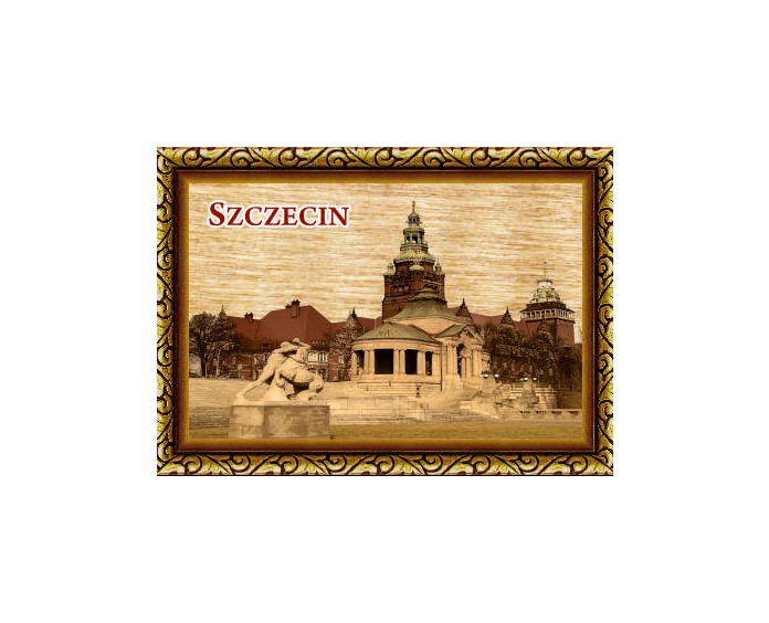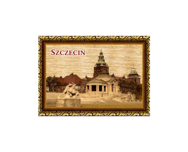 Magnes wykonany ze sklejki z nadrukowaną grafiką przedstawiającą zabytki Szczecina.