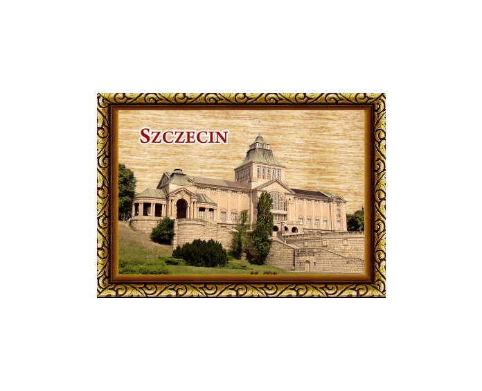 Magnes wykonany ze sklejki z nadrukowaną grafiką przedstawiającą zabytki Szczecina.