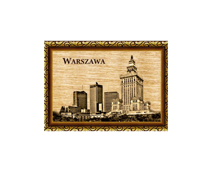 Magnes wykonany ze sklejki z nadrukowaną grafiką przedstawiającą zabytki Warszawy.
