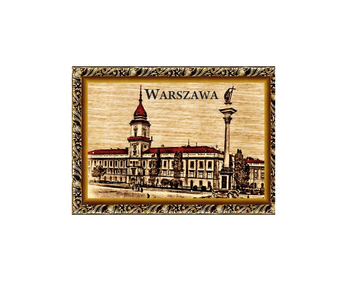 Magnes wykonany ze sklejki z nadrukowaną grafiką przedstawiającą zabytki Warszawy.