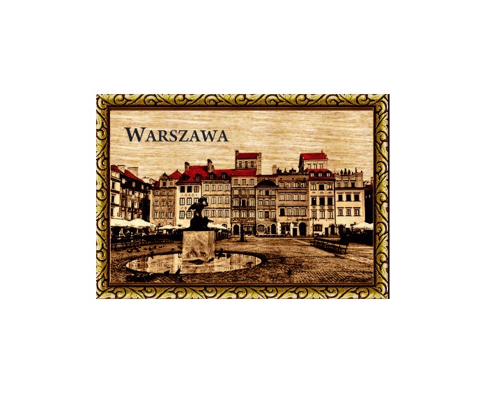 Magnes wykonany ze sklejki z nadrukowaną grafiką przedstawiającą zabytki Warszawy.
