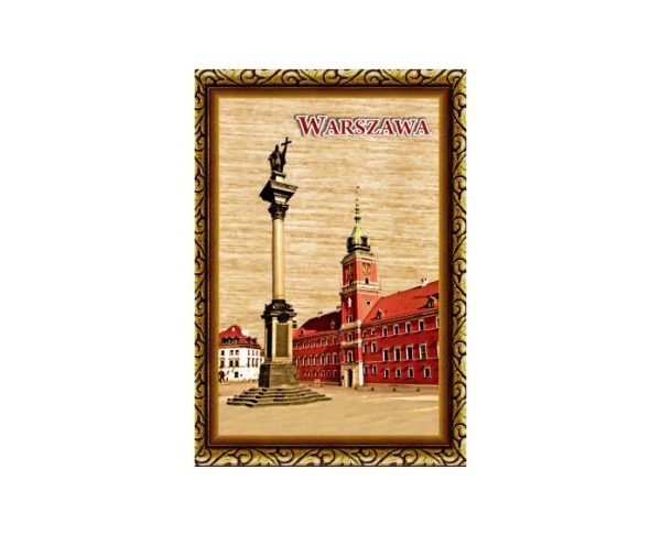 Magnes wykonany ze sklejki z nadrukowaną grafiką przedstawiającą zabytki Warszawy.
