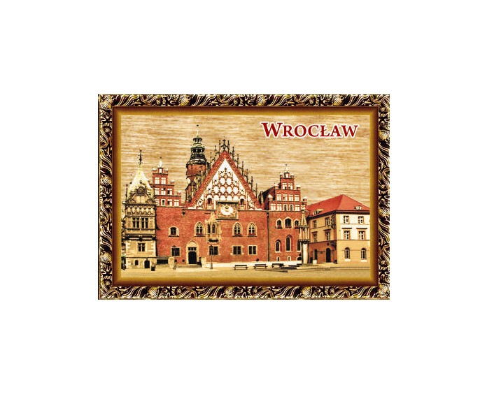 Magnes wykonany ze sklejki z nadrukowaną grafiką przedstawiającą zabytki Wrocławia.