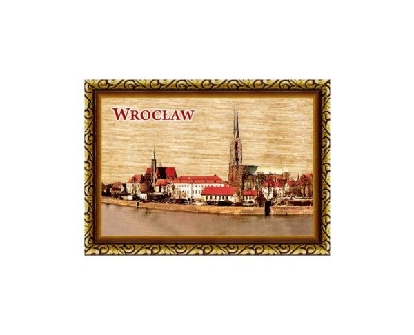 Magnes wykonany ze sklejki z nadrukowaną grafiką przedstawiającą zabytki Wrocławia.